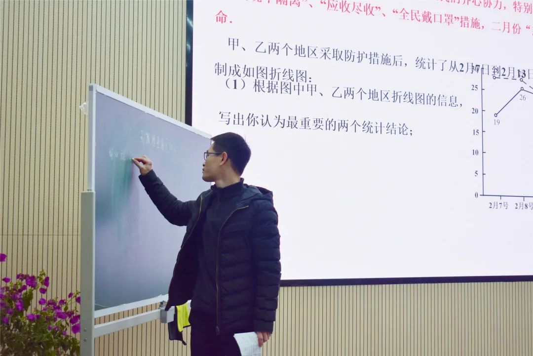 于欣欣老师同样选择的是新冠疫情期间的题材,数学教研组集体改编了一道题,通过数学建模,让疫情的高传染性,与防护知识的有效性有了具体、数学上的认识。数学教研组长陈秋生老师认为于老师是后起之秀,于老师的教学兼顾教知识的传授和课堂气氛的调节,未来可期。